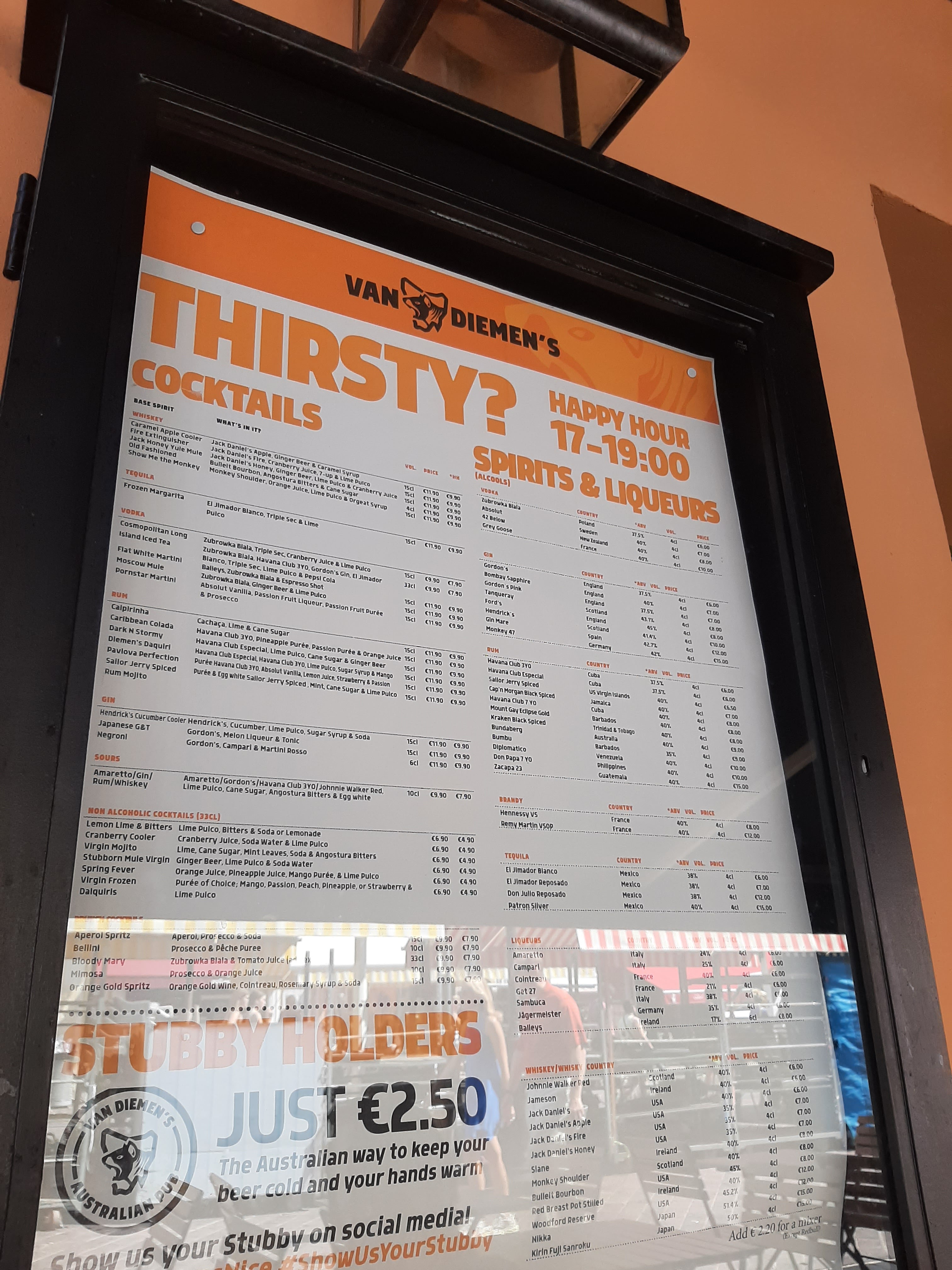 Posté le 24/11/2023 à 08:50"Petit passage ce jour au Pub Van Diemens pour un Irish coffee , malheureusement l’accueil peu chaleureux ( l’impression de déranger ) la porte d’accès qui claque à chaque passage , pas de musique ….. bof"
